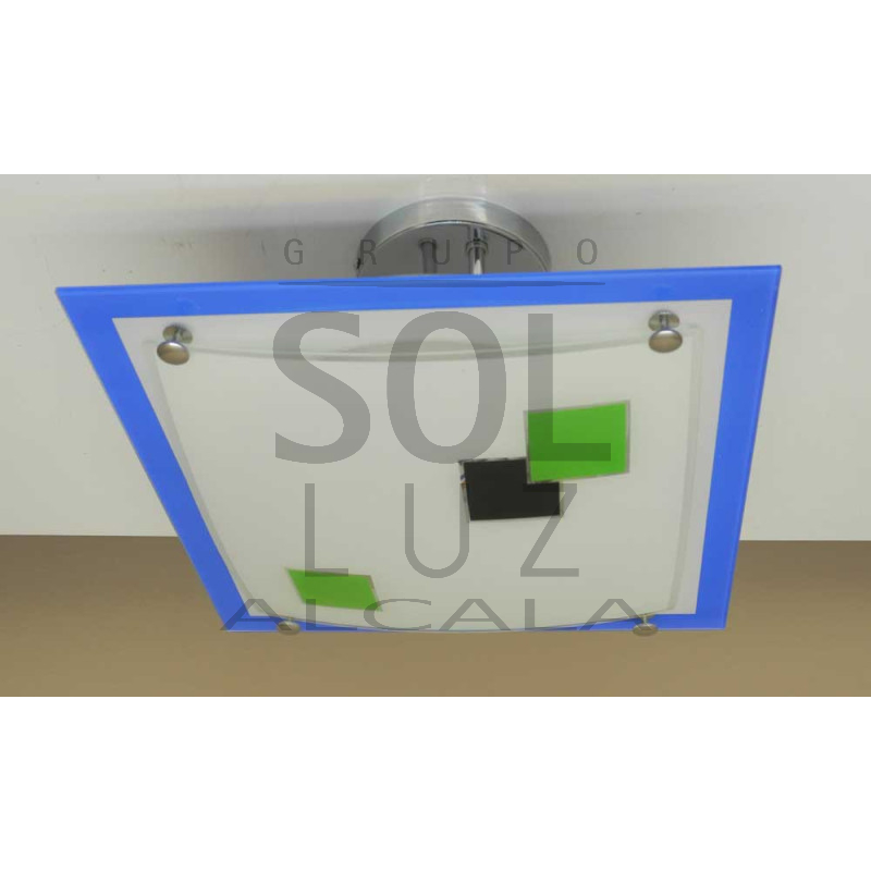 Semiplafón cuadrado azul con un cristal decorado con cuadrados en color verde y decoración en cromo. Portalámparas E27.
