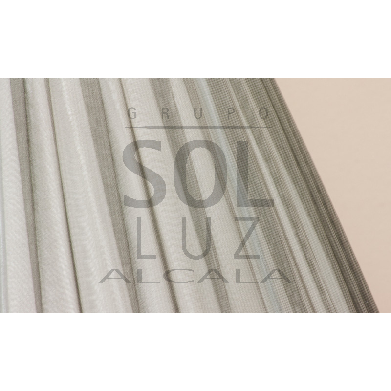 Elegante pantalla de tela en color gris fruncido con un galón en gris y una pequeña y fina tira plateada trenzada.