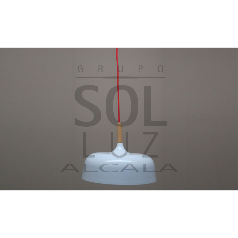 Lámpara colgante de metal en color blanco con el cable en color rojo y un pequeño detalle en madera, regulable en altura. Portalámparas E27.