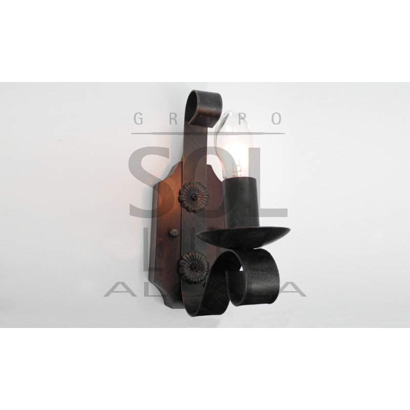 Aplique de estilo rústico con la base en madera y un sencillo brazo en forja negra. Portalámparas E14.