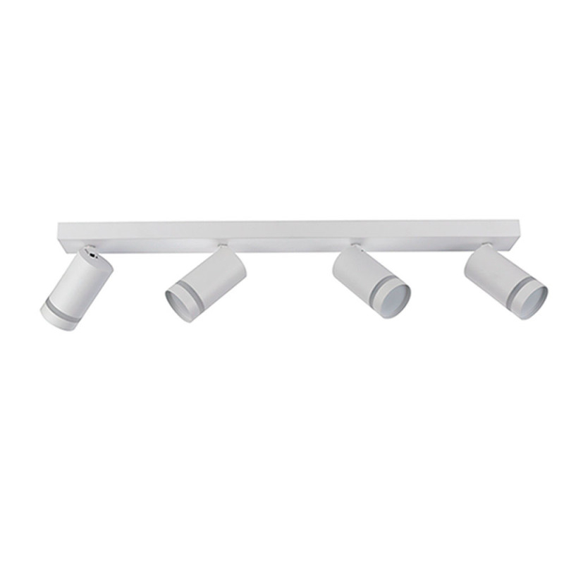 Regleta de focos en estilo moderno y líneas rectas con cuatro luces totalmente orientables en color blanco. Portalámparas GU-10.