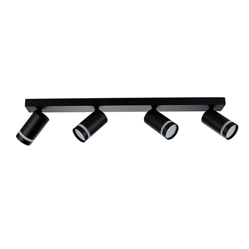 Regleta de focos en estilo moderno y líneas rectas con cuatro luces totalmente orientables en color negro. Portalámparas GU-10.