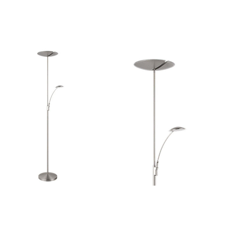 Es un pie de salón orientable en níquel con lo último en tecnología LED. Con un consumo de 30w en la parte superior y 6w en el brazo de lectura. Además de una potencia envidiable, cuenta con regulador de intensidad y 3 cambios de tono de luz.