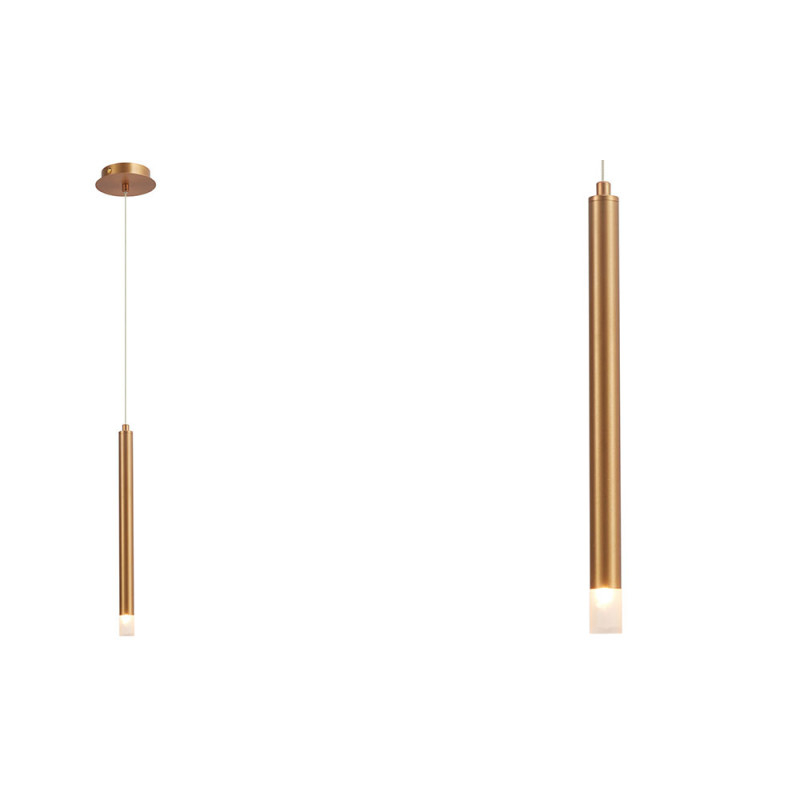Colgante serie TUBO en estilo moderno y líneas rectas con una luz en color dorado cepillado. Ideal para iluminar una isla de cocina, mesa de comedor, luz de noche para la mesilla... Portalámparas G9.