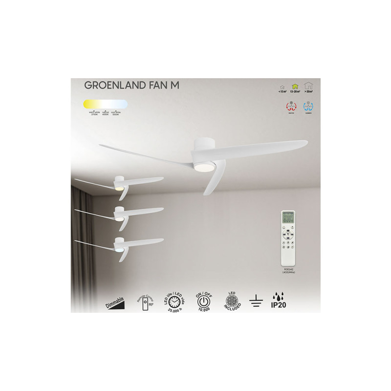El modelo GROENLAND de MANTRA diseñado por José Ignacio Ballester, tiene un diseño original, moderno y combinable con cualquier decoración. Incluye lo último en tecnología LED con solo 24w de consumo, 2640Lm. Estéticamente es un ventilador con un diseño y elegancia espectacular. Se instala fácilmente y de una forma muy segura.