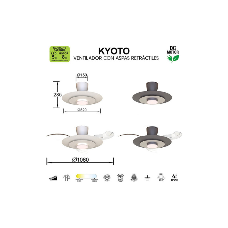El modelo KYOTO de MANTRA diseñado por Davide Negrí, es un estilo en auge siendo una gran novedad. Llamativo por su original diseño. Es una pieza decorativa y práctica. Un ventilador que llamara la atención por su apariencia y decorara cualquier estancia de la casa haciéndola única . Incluye lo último en tecnología LED con solo 20w de consumo, 3600Lm. Estéticamente es un ventilador con un diseño y elegancia espectacular. Se instala fácilmente y de una forma muy segura.